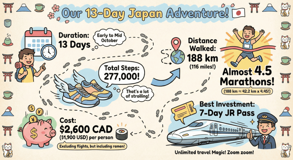 Let’s be real—there’s no such thing as a “perfect” Japan itinerary unless you’re staying for months. The country has too much to offer. This was our take on maximizing 13 days, and it worked brilliantly for us. This wasn’t a relaxing vacation—it was an exploration trip. We walked an average of 14.4 km (8.9 miles) every single day and loved every minute of it.
